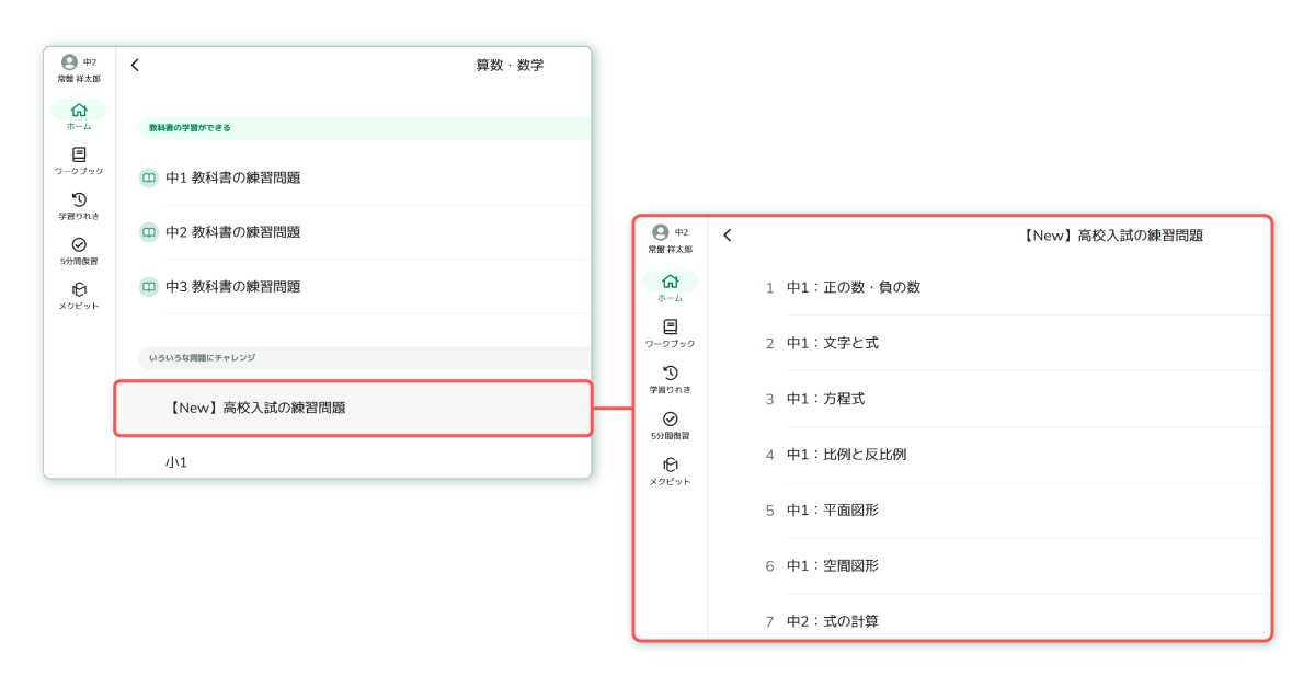 - 「ワークブック」機能で先生が問題を指定して配信するほか、子どもたちの学習画面の目次から「高校入試の練習問題」に取り組むことができます。教科書の問題を解き終えた後の力試しなど、さらに問題を解きたいという子どもたちの意欲に応えます。