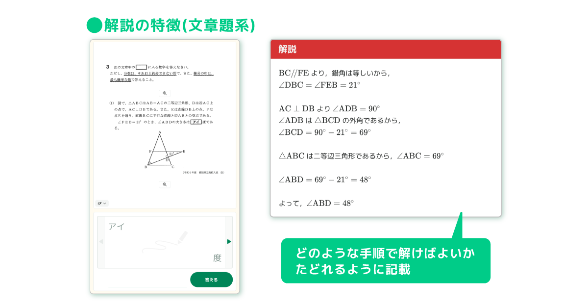 - 問題ごとに分かりやすい解説を搭載し、子どもたち自身による自律的な学習をサポートします。
