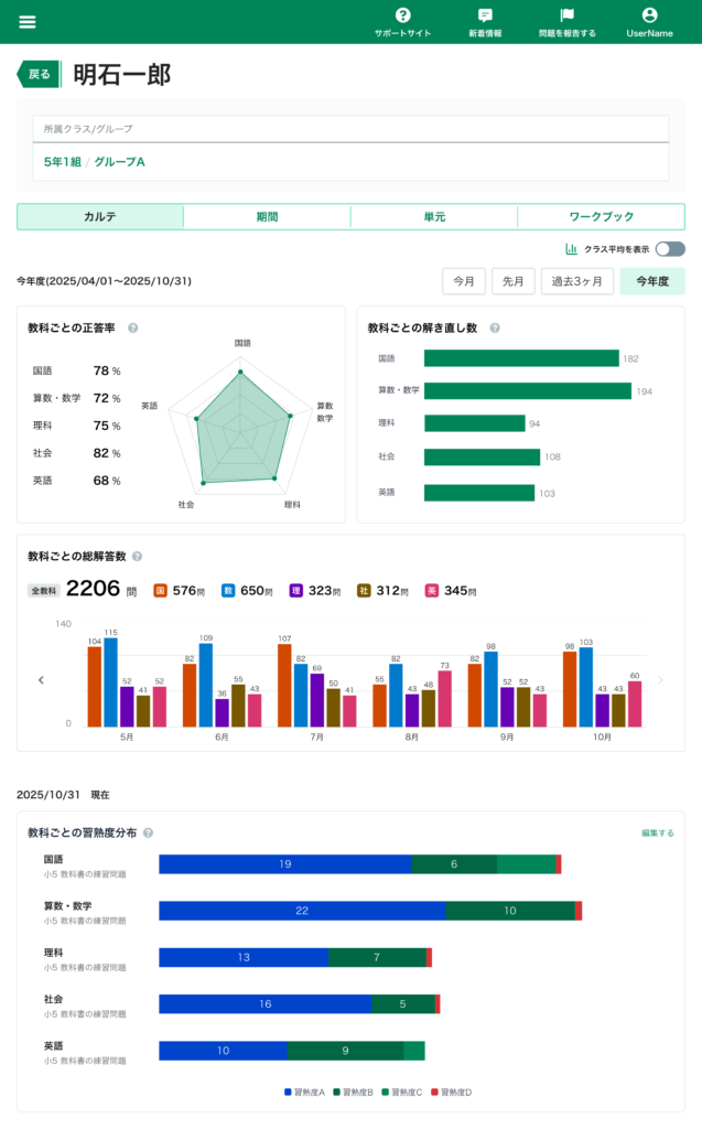 - 現在までの取り組み推移を示す<正答率><解き直し数><総解答数>と、画面表示時点の理解度を示す<習熟度分布>により、一人ひとりの学びの変化を俯瞰で確認することができます。