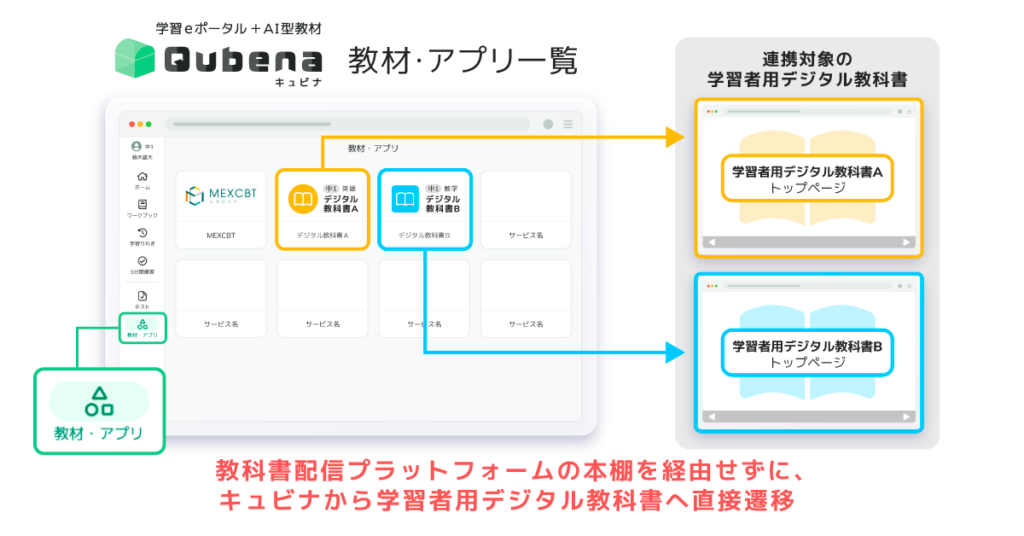 そうした取り組みの一環として、このたび、キュビナの学習eポータルと、富士ソフト株式会社が提供するデジタル教科書配信プラットフォーム「みらいスクールプラットフォーム」とのLTI連携により、開隆堂出版株式会社、学校図書株式会社、教育出版株式会社、日本文教出版株式会社の学習者用デジタル教科書とのSSO認証および名簿連携に対応いたしました。SSO認証によりキュビナと学習者用デジタル教科書の学びがシームレスにつながるとともに、名簿連携により年度更新などのアカウント・ライセンス管理にかかる負担が軽減され、学校現場の働き方改革にも寄与いたします。本連携の提供開始は2026年4月を予定しております。