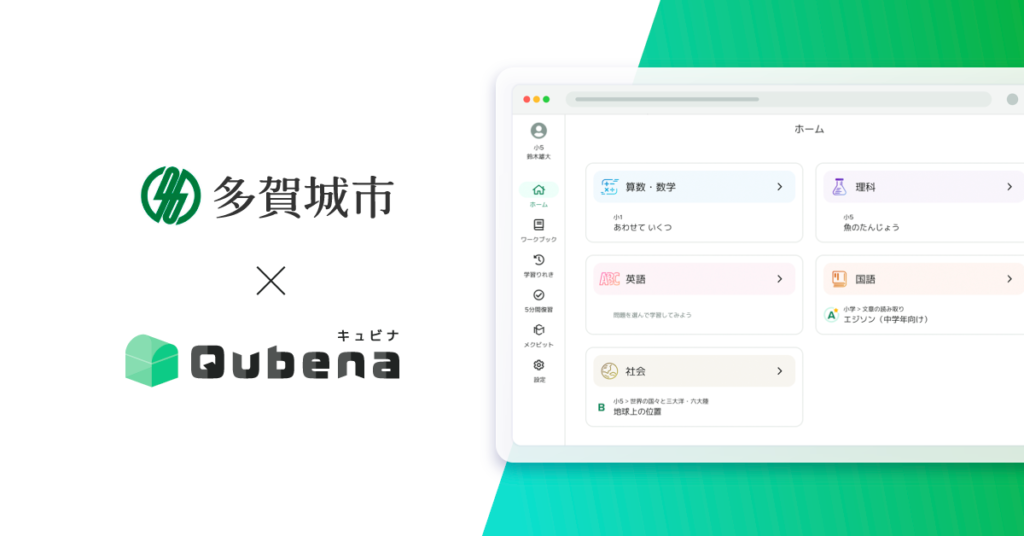 多賀城市では、学校ICT構想計画「多賀城市スマートスクール ~ICT整備とDXで拓く新時代の教育~」を策定し、児童生徒が自ら学び、課題を解決する力を育成するための学習環境整備を進めています。同計画では、AI等の先端技術を活用し、児童生徒一人ひとりの学習進捗や習熟度に応じた「個別最適な学び」を高度化・個別化することを重点施策としています。その一環として、「個別最適な学び」を同市のすべての児童生徒に保障するため、このたび学習eポータル+AI型教材「キュビナ」を全市立小中学校10校で採用、2026年3月より小学1年生〜中学3年生約5,000人が利用を開始いたしました。