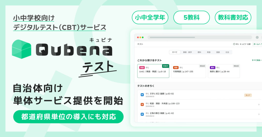 学習eポータル+AI型教材「キュビナ」を開発・提供する株式会社COMPASS(本社:東京都文京区、代表取締役:佐藤 潤、以下 COMPASS)はこのたび、小中学校向けデジタルテスト(CBT)サービス「キュビナ テスト」について、学習eポータル+AI型教材「キュビナ」の導入有無にかかわらずご利用いただける、単体サービスとしての提供を2026年度より開始することをお知らせします。対象は自治体で、都道府県単位での導入も可能です。また、自治体独自の問題搭載への対応も予定しており、「キュビナ テスト」上で自治体の学力調査等を実施いただくことが可能になります。